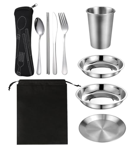 10 stycken campingservis i rostfritt stål, utomhus bestick 2 personer med mattallrik, tallrik, mugg, sked, gaffel, knivar, chopsticks, campingservis för camping, resor, picknick