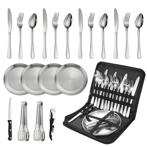 VBNZBK Camping bestick-set, 20 stycken campingservis set 4 personer rostfritt stål, bestick camping med sked gaffel kniv tallrik klämma för 4 camping picknick vandring