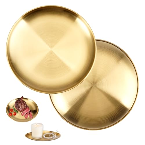 2 stycken rund bricka guldplatta 20 cm, rostfritt stål dekottallrik guld, rostfritt stål gyllene tallrik, gyllene rund bricka liten, serveringsbricka guldtallrik för hem, kök, camping, matsal