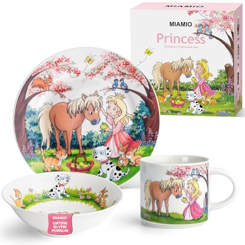 MIAMIO - Set med 3 barnserviser/barnservis i porslin, barnservis, barnbestick - inkluderar tallrik, skål och kopp - för barn och småbarn (Prinsessa)