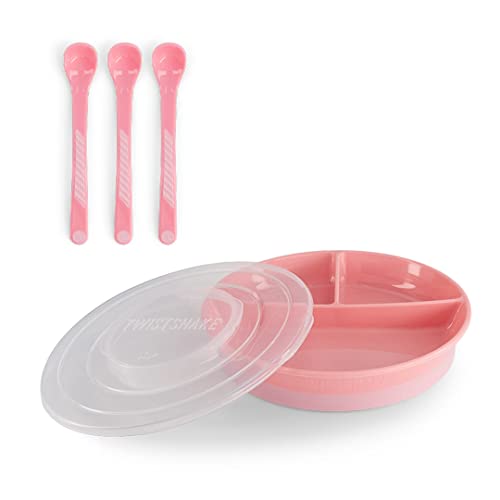 Twistshake Barnservis Set | 3-delad tallrik + Bebisskedar 3-pack | BPA-fri Barntallrik och Barnbestick | Matträningskit för barn | Barnmatsset | Bebisprodukter | Rosa