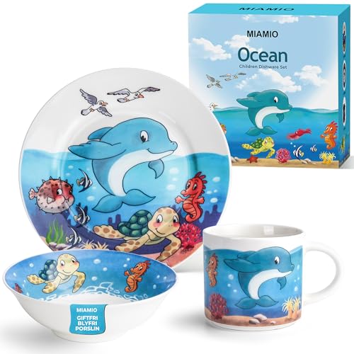 MIAMIO - Set med 3 barnserviser/barnservis i porslin, barnservis, barnbestick - inkluderar tallrik, skål och kopp - för barn och småbarn (Ocean)