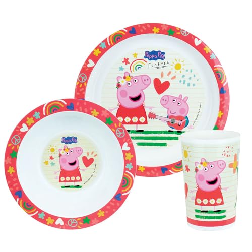 Fun House 006105 Peppa Pig-set för barn med 22 cm platt tallrik, 16 cm djup tallrik och ett glas 220 ml, flerfärgad, 3 delar