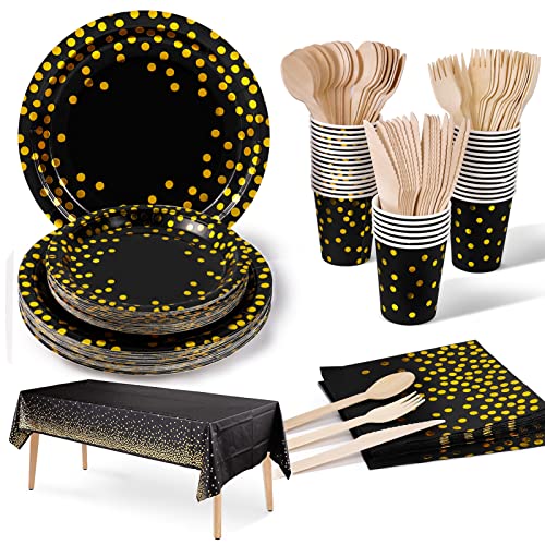 Partyservis för barn, 141 stycken papperstallrikar i svart guld festtillbehör födelsedag flicka fest dekoration papper porslin set inklusive tallrik mugg servetter för 20 gäster