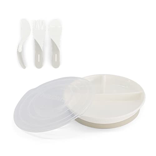 Twistshake Barnservis Set | 3-delad tallrik + Bebisbestick i Rostfritt Stål 12+m | BPA-fri Barntallrik och barnskål | Matträningskit för barn | Babytallrikar | Bebisprodukter | Vit