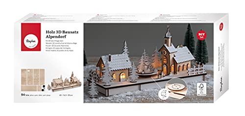Rayher Alpendorf, trä, FSC-certifierad, 3D-byggsats med roterande mekanism, natur, 40 x 14,5 x 20 cm, 94 delar inklusive roterande tallrik, juldekoration, 63157505