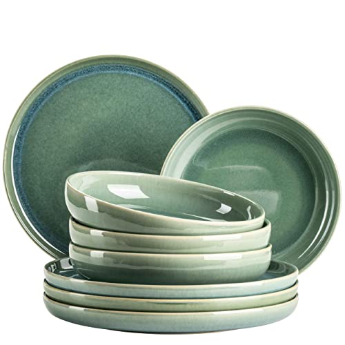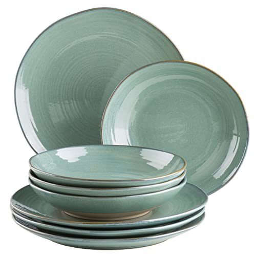 MÄSER Serie Nottingham, vintage tallriksset för 4 personer, 8-delad middagsservis med mattallrikar och sopptallrikar i oregelbundet rund retrolook, stengods, turkos-grön