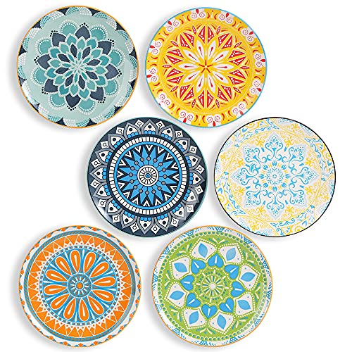 AHX Middagstallrikar i keramik, tallriksset, 25 cm (10 tum), stor rund porslinstallrik, set om 6, platta, färgglatt mönster, middagstallrikar för kök, familj, säkra för diskmaskin, mikrovågsugn och