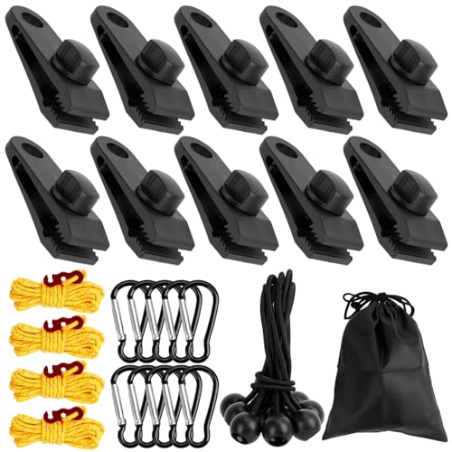 Dadabig 10 st campingklämma, svart fästpresenningsklämma för tält, presenning, skyltar, inkluderar 10 elastiska band med boll, 10 karbinhake, 4 vindtäta spännrep