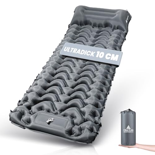 HIKENTURE Liggunderlag, självuppblåsande, 10 cm campingluftmadrass, litet packmått, uppblåsbar sovmatta med fotpump, för camping, utomhus, vandring och tält, grå A1