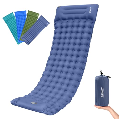 ERWEY Campingmatta självuppblåsande utomhusluftmadrass, 200 x 70 cm, vikbar med fotpump, ultralätt uppblåsbar, vattentät uppblåsbar madrass för camping, vandring, strand, tält, blå.