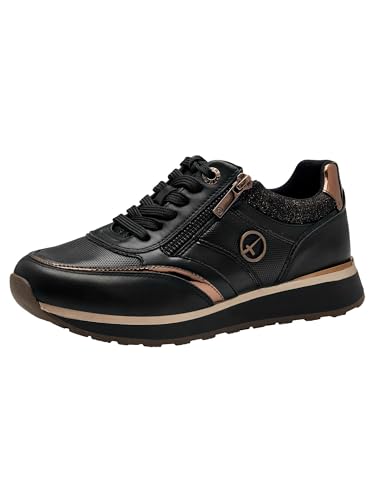 Tamaris dam låga sneakers, dam halvskor, utbytbar fotbädd, Svart guld, 42 EU