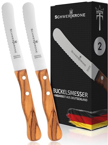 Svärdkrone® puckelkniv, vågad skärning, set om 2 [tillverkad i Tyskland] – tandad slipkniv, olivträhandtag – bordskniv, tandad kniv – brödkniv – kniv med trähandtag – brödkniv