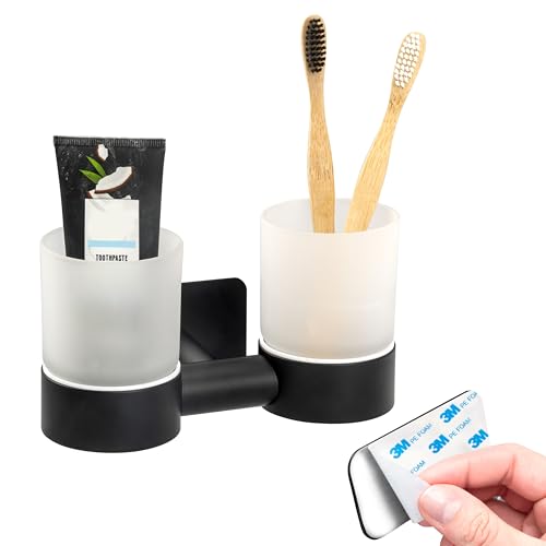 bremermann Badserie Piazza Black Tape – dubbel glaskopphållare utan borrning, med självhäftande dyna – självhäftande – kopphållare, tandborsthållare, tillverkad av glas och rostfritt stål, matt svart