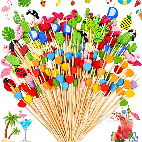 200 stycken cocktailplektrum trä tandpetare, cocktailpinnar färgglada, cocktail tillbehör dekorationsset, med hjärta, vattenmelon, ananas, rosa flamingo, kaktus, bra för bar, fest, barn (färgglad)