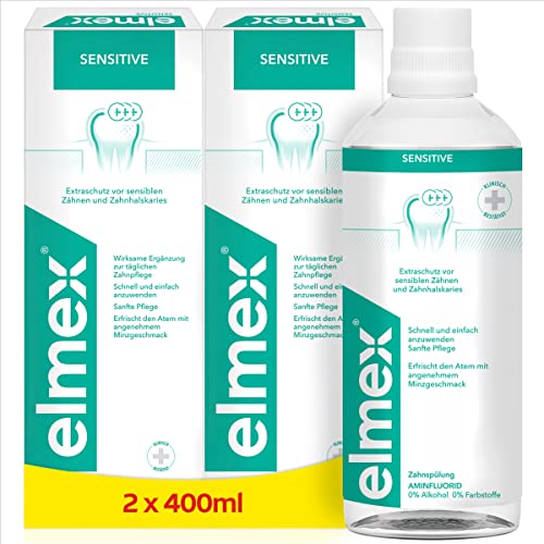 elmex munsköljning Sensitive 2 x 400 ml – munsköljning för extra skydd mot smärtkänsliga tänder och tandhalskaries – för daglig tandrengöring utan alkohol med mintsmak
