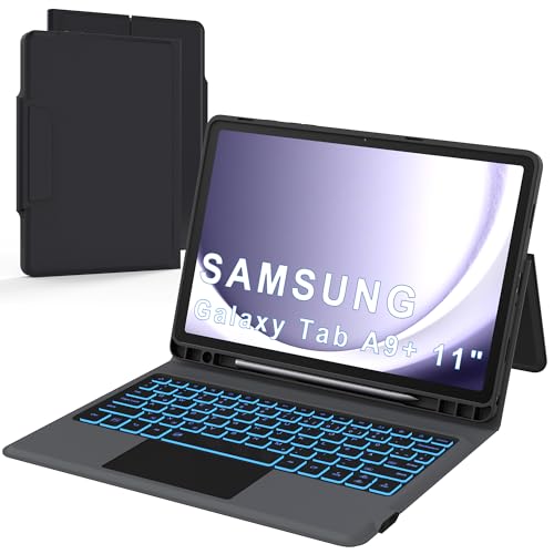 För Samsung Galaxy Tab A9 11 tums fodral med tangentbord – folio 7 färgade upplysta pekplatta surfplattefodral med pennhållare – tyskt QWERTZ-layouttangentbord med pekplatta för Tab A9 Plus 11 tum