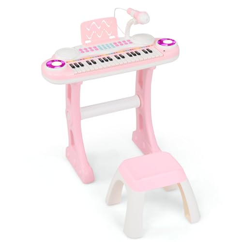 KOMFOTTEU Barnpianoset med 37 knappar, elektroniskt piano med ljuseffekter och justerbar mikrofon, pianotangentbord inkl. pall, tangentbord, 8 rytmer/toner för barn 3+ år (rosa)