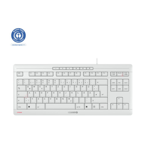 CHERRY STREAM KEYBOARD TKL, tysk layout, QWERTZ-tangentbord, trådbundet tangentbord, Blue Angel, SX saxmekanism, viskande tyst tangenttryckning, vit-grå