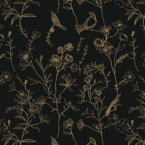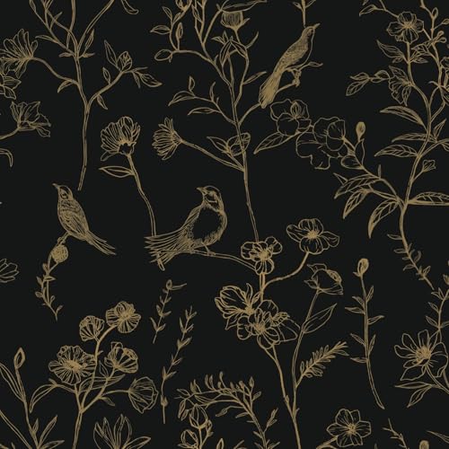 Fiula Självhäftande Tapet Med Fåglar Och Blommor, 41 Cm X 300 Cm, Svart Och Guld, Med Linjer, Mönstertapet, Möbelfolie, Vintage, Dekorativ, För Vardagsrum, Blommig Tapet, Vattentät