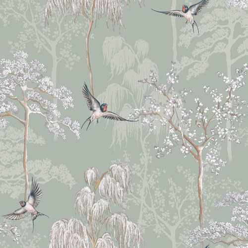 Arthouse japansk trädgård grå tapet – handritade orientaliska träd – fåglar på en mjuk grå bakgrund – handritat mönster – pärlemorskimrande höjdpunkter ger textur – skapa en avslappnande effekt –