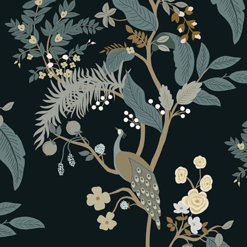 ReWallpaper 44.5CM x 7M Foto Tapet Blommor Vintage Självhäftande Tapet Grön Guld Blommig Tapet Självhäftande Tapet Turkos Guld Med Fåglar Och Blommor Självhäftande Tapet Film Furniture Pattern Foil