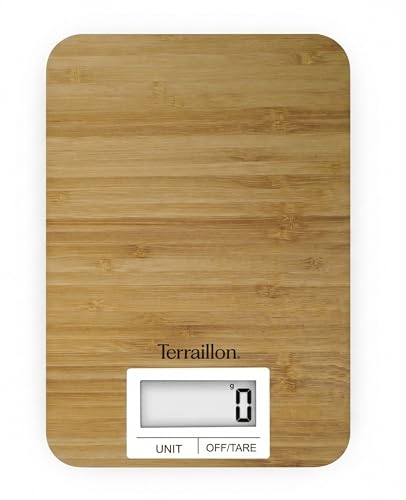 Terraillon 14749 glas, ekologisk köksvåg med dynamo, tara-funktion och vätskeomvandling, kapacitet 5 kg, vit, bambu