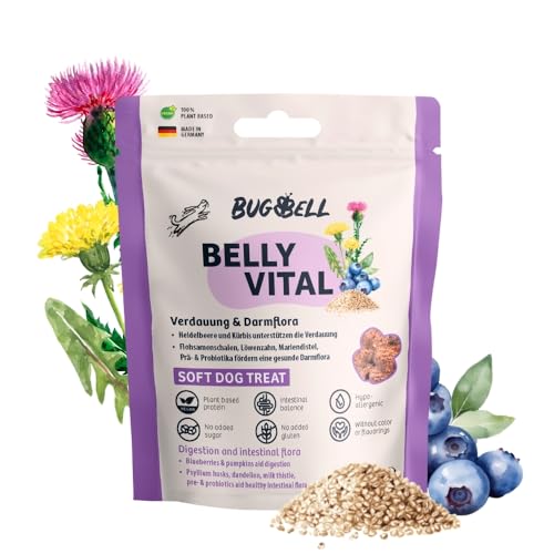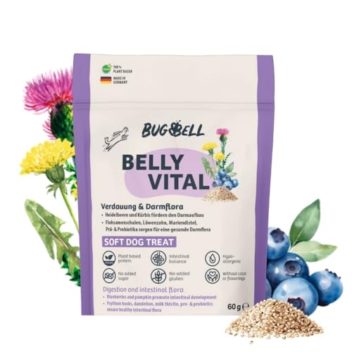 BugBell Snacks hundar 60 g, matsmältning och tarmflora, fettreducerad och skonsam för magen, vid problem med diarré och kräkningar, maskros, mjölktistel, prebiotika och probiotika