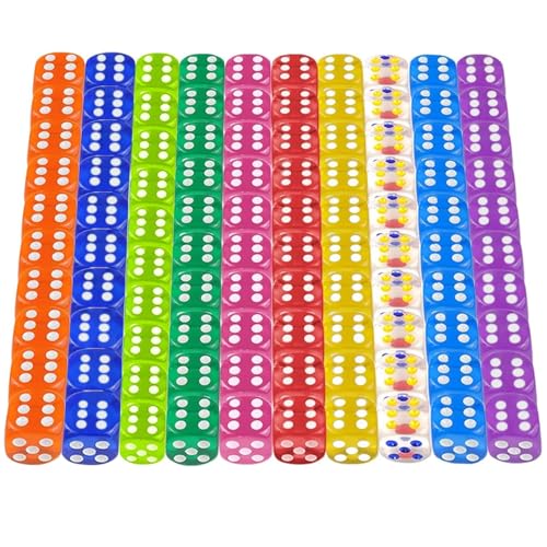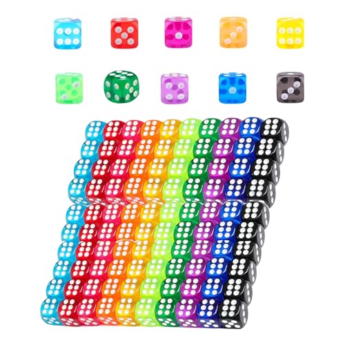 HUAZIZ 100 stycken tärningar 12 mm färgglada tärningar, 6 sidor 10 färger, genomskinliga, färger tärningsset för tärningsspel, bordsspel, brädspel, matematik spel