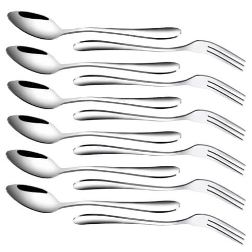 RETON Set med 12 st efterrättsgafflar och skedar i rostfritt stål, 3 formar tårta frukt biffgaffel och tesked kaffeskopor för hem, bröllop, fest, café, restaurang, present (6 gafflar + 6 skedar)
