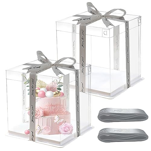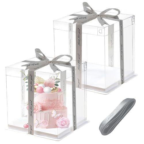 RHBHY 2 stycken tårtlådor tårtkartong tårtlåda 21 x 21 x 24 cm tårtlåda transparent tårta transportlådor presentförpackning genomskinlig med bas och band för födelsedag dessert (21 x 21)