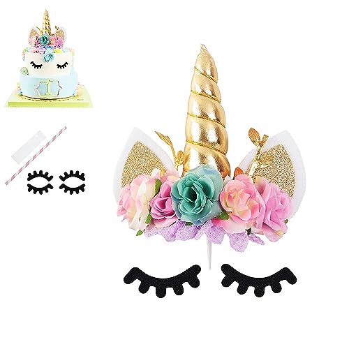 Enhörning tårta toppare guldkaka toppare för födelsedag, bröllop, fest, tårtdekoration, söta horn öron och ögonfransar, tårta dekoration, för fest, babyparty (regnbågsfärg)