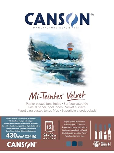CANSON Mi-Teintes Velvet, tårtpapper, sammetslen yta, 430 gsm, kort sida limmade block, 24 x 32 cm, 3 kalla toner, 12 ark