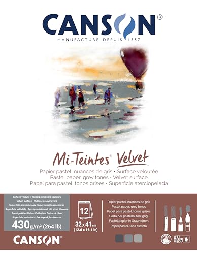 CANSON Mi-Teintes Velvet, tårtpapper, sammetslen yta, 430 gsm, kort sida limmade block, 32 x 41 cm, 3 grå nyanser, 12 ark