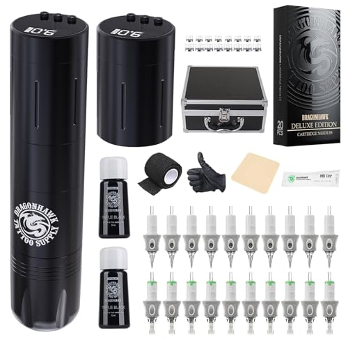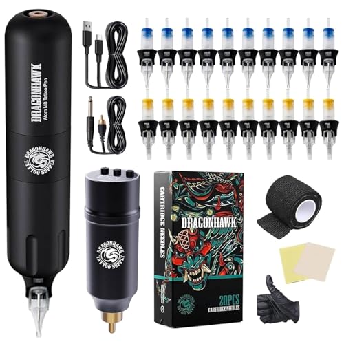 Dragonhawk Tattoo Kit Set, Rotary Pen Wireless Pen Machine Gun Coreless Motor 3.5mm Stroke Length 20 pcs Cartridges Tattoo nadeln for beginner