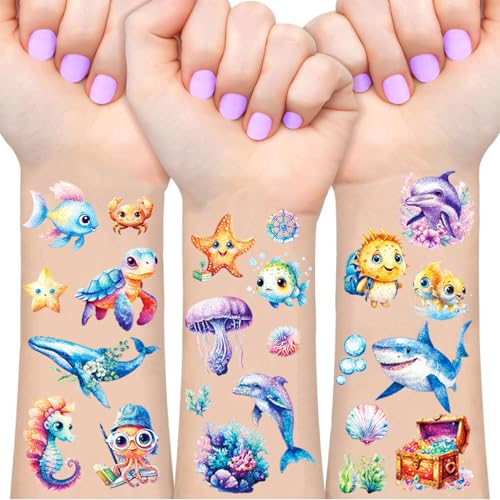 Tillfälliga Tatueringar för Barn, 12 ark Ocean Tillfällig Tatuering Klistermärken Set för flickor Pojkar Barntatueringar Vattentät Som Födelsedag Present Festival Party Dekoration