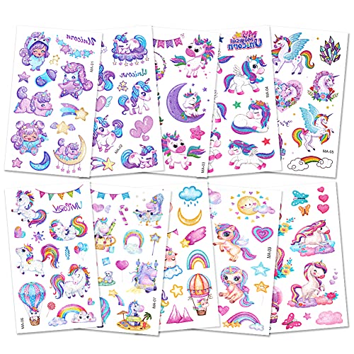 AOOWU Glitter tatuering set barn, 10 ark enhörning glitter tatueringar flickor, vattentäta barn tatueringsklistermärken pojke, tillfälliga barntatueringar för fest dekoration gåvor gåvor barns