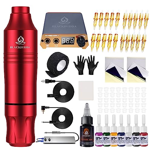 Blackbudda Tattoo Machine, Tatuering Set Med Strömförsörjning Färgstarkt Pigmentpatronpennsats för Professionell roterande maskinsats Professionell komplett, 20 stycken patronnålar (röd)