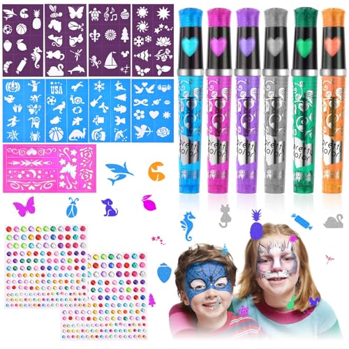 AOMIG Tattoo Pen Set, 6 Glitter Color Marker Tatuering Penna med 9 schabloner och 2 ansiktsfärgade strass, Tattoo Gel Pens Set för pojkar Flickor Halloween Party Dress Up
