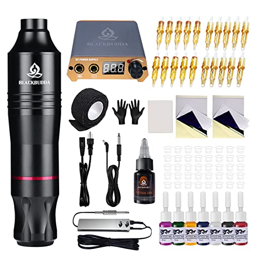 Blackbudda Tattoo Machine, Rotary Tatuering Set med strömförsörjning, fotpedal och pigment, 10st patronnålar Semi Makeup Practice Kit för tatueringskonstnärer (Svart)