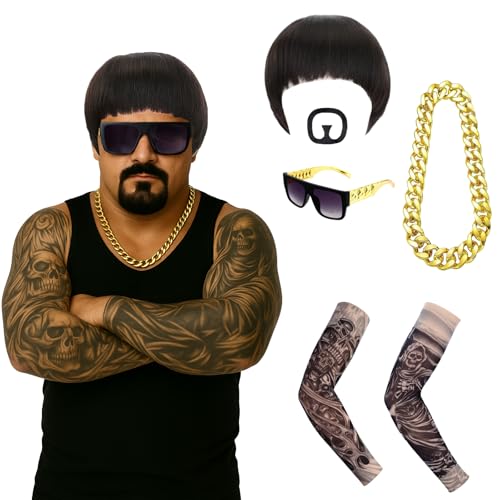 SSKHE Final Boss meme förklädnad set - skålklippt peruk, bock och mustasch, solglasögon, guldkedja och tatueringsärmar, 90-tals meme cosplay-outfit, Ibiza rolig för halloween, fest