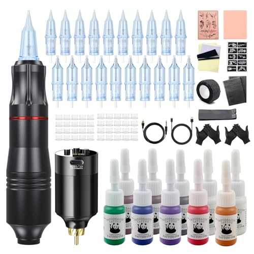 Biomaser tatueringsmaskin set trådlös tatueringsmaskin 1500 mAh batteri roterande tatueringspenna med 20 stycken tatueringsnålar 10 flaskor tatueringsbläck för tatuering nybörjare och konstnärer