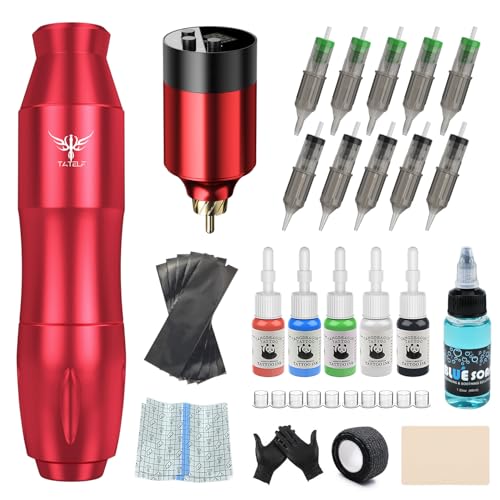 TATELF Trådlös tatueringssats, professionell permanent sminkmaskin med 2 st batterier 10 st patroner nålar permanent makeup tatueringspenna för nybörjare