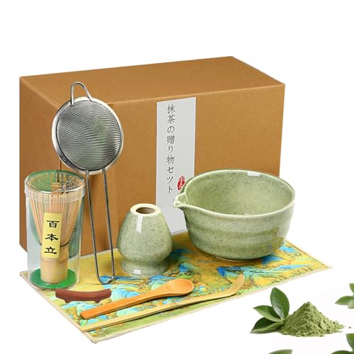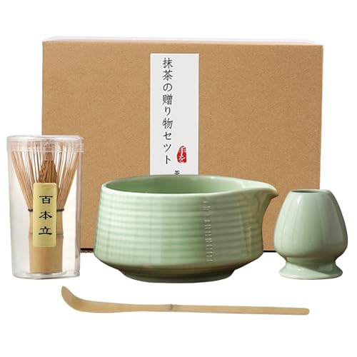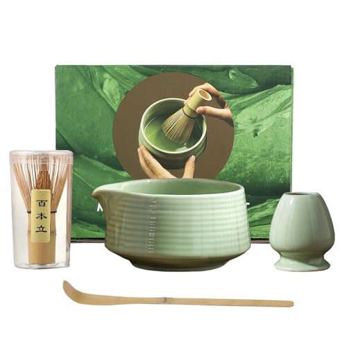 Hisdricus Matcha-set – 4-delat matcha-te-set för teceremonin: keramisk matcha-skål med pip, bambuvisp och hållare, matcha-sked – Klassisk grön present för teceremonin
