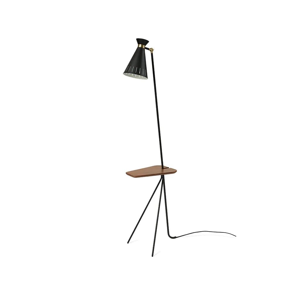 Warm Nordic Cone golvlampa black noir, teakbord, mässingsdetaljer