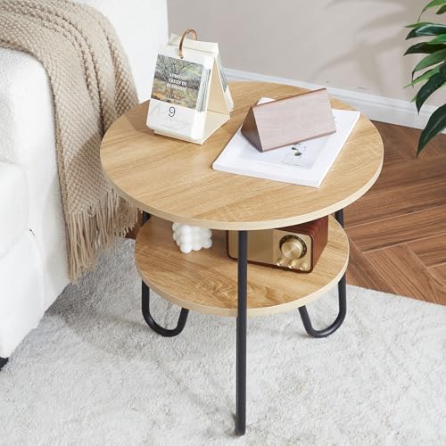 Mingone runt soffbord, sidobord, vardagsrumsbord, tebord, dubbelskiktsdesign, 50 cm, soffbord i trä, lämplig för vardagsrum, metallmaterial, lätt att montera (träfärg).