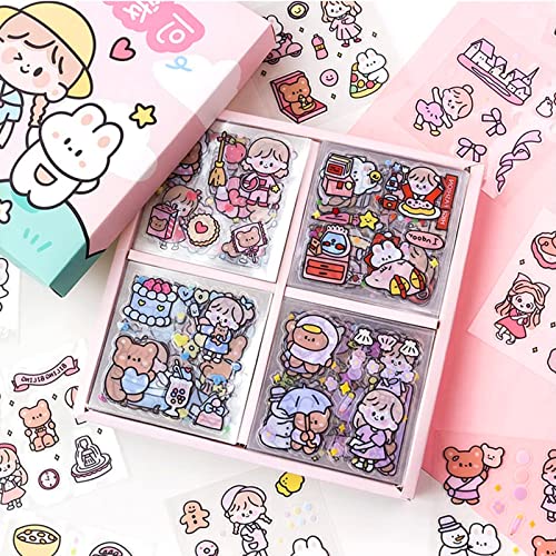 FANNAS Kawaii klistermärken 100 ark mini tecknad flicka klistermärken söt figur klistermärken set scrapbooking PET transparent scrapbook, estetisk för journaling, kalender, gör-det-själv-hantverk