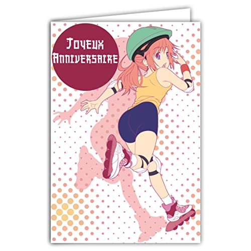 Afie 67-1239 Grattis på födelsedagen kort med kuvert - manga tecken japansk tecknad superhjältinna rullskridskor rosor sportig ung flicka tonåring