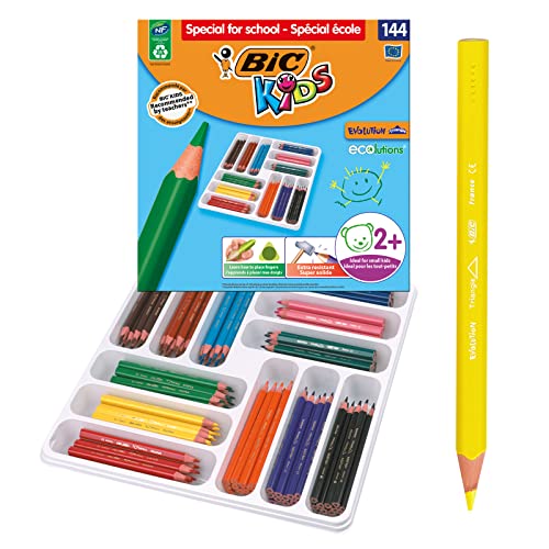 BIC Kids Evolution ECOlutions triangulära färgpennor – klasspaket med 144 pennor för skola och teckning – blandade färger