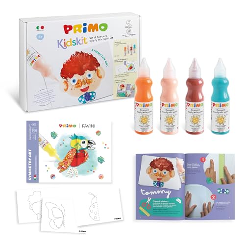 PRIMO Kidskit Symmetry Art-färgkit för barn + 5 år, set med 4 ergonomiska tempers och dispenser 50 ml, 1 målarboksalbum för teckning, 1 kreativt hantverk, konstpedagogiska spel
